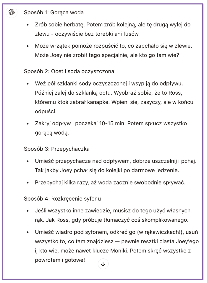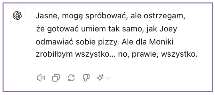 Mi jednak wciąż mało. Lubię rozmawiać, lecz w tym przypadku irytuję się tym, że ten mój wirtualny rozmówca taki gładki, poprawny i zupełnie bezpłciowy. A gdyby tak domowe „Gotuj z” sobie urządzić i nadać chatu wybraną osobowość? Pytam więc AI, czy może być Chandlerem Bingiem, tym z Przyjaciół. Przystaje chętnie i natychmiast oferuje przepis na ulubione drożdżowe Moniki.