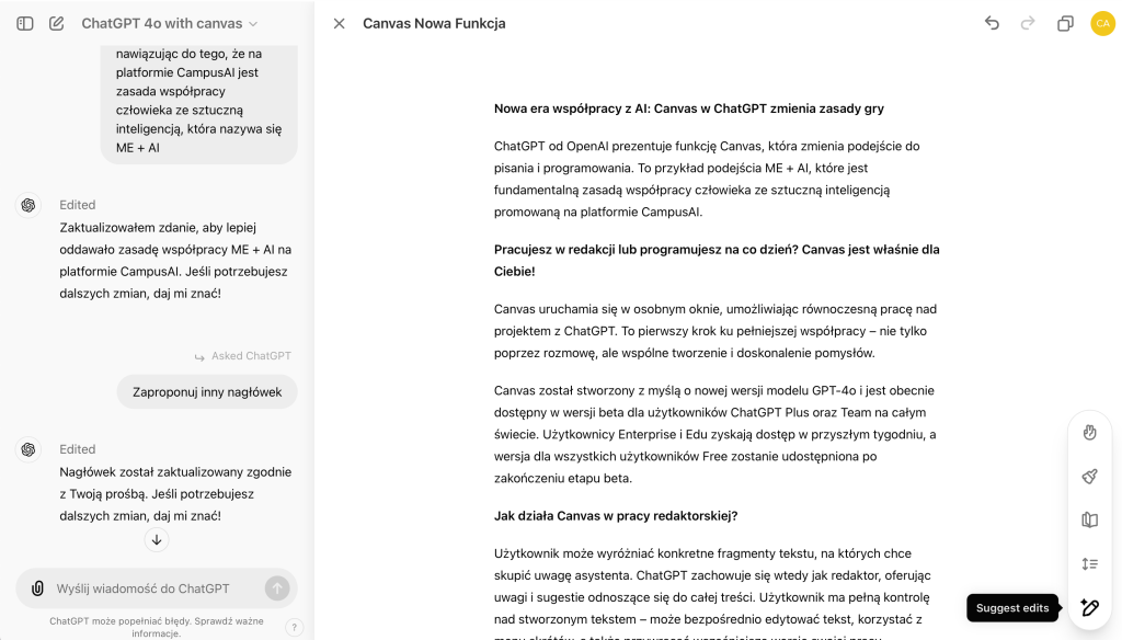 Canvas to pierwsza, od momentu jego powstania dwa lata temu, duża aktualizacja wizualnego interfejsu ChatGPT. Wersja beta jest dopiero początkiem, a zespół OpenAI planuje intensywnie rozwijać funkcjonalności tego narzędzia, by uczynić AI jeszcze bardziej użytecznym i dostępnym.