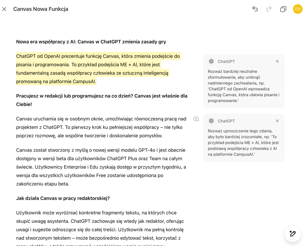 Użytkownik może wyróżniać konkretne fragmenty tekstu, na których chce skupić uwagę asystenta. ChatGPT zachowuje się wtedy jak redaktor, tj. oferuje uwagi i sugestie odnoszące się do całej treści. Użytkownik ma pełną kontrolę nad stworzonym tekstem – może bezpośrednio edytować tekst, korzystać z menu skrótów, a także przywracać wcześniejsze wersje swojej pracy.